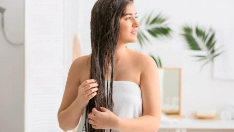 بعد انتهاء فترة التعرض، اغسلي شعرك بشامبو خفيف، ويفضل أن يكون خاليًا من الكبريتات، لإزالة الزيت. قد تحتاج إلى القيام بأكثر من غسلة واحدة لإزالة الزيت تمامًا. اتبعيه ببلسم خفيف لإضافة ترطيب إضافي.